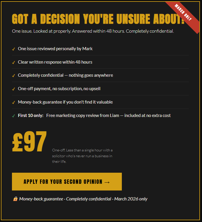 The solicitor? They’ll take your £400 an hour and give you a risk matrix. They’ve never missed a payroll. Never done a management buyout with their own money on the line. Never had to choose between two bad options at 11pm on a Sunday.